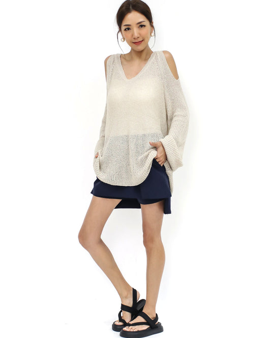 beige & ivory knitted cardigan w/ grey hoodie *pre-order*