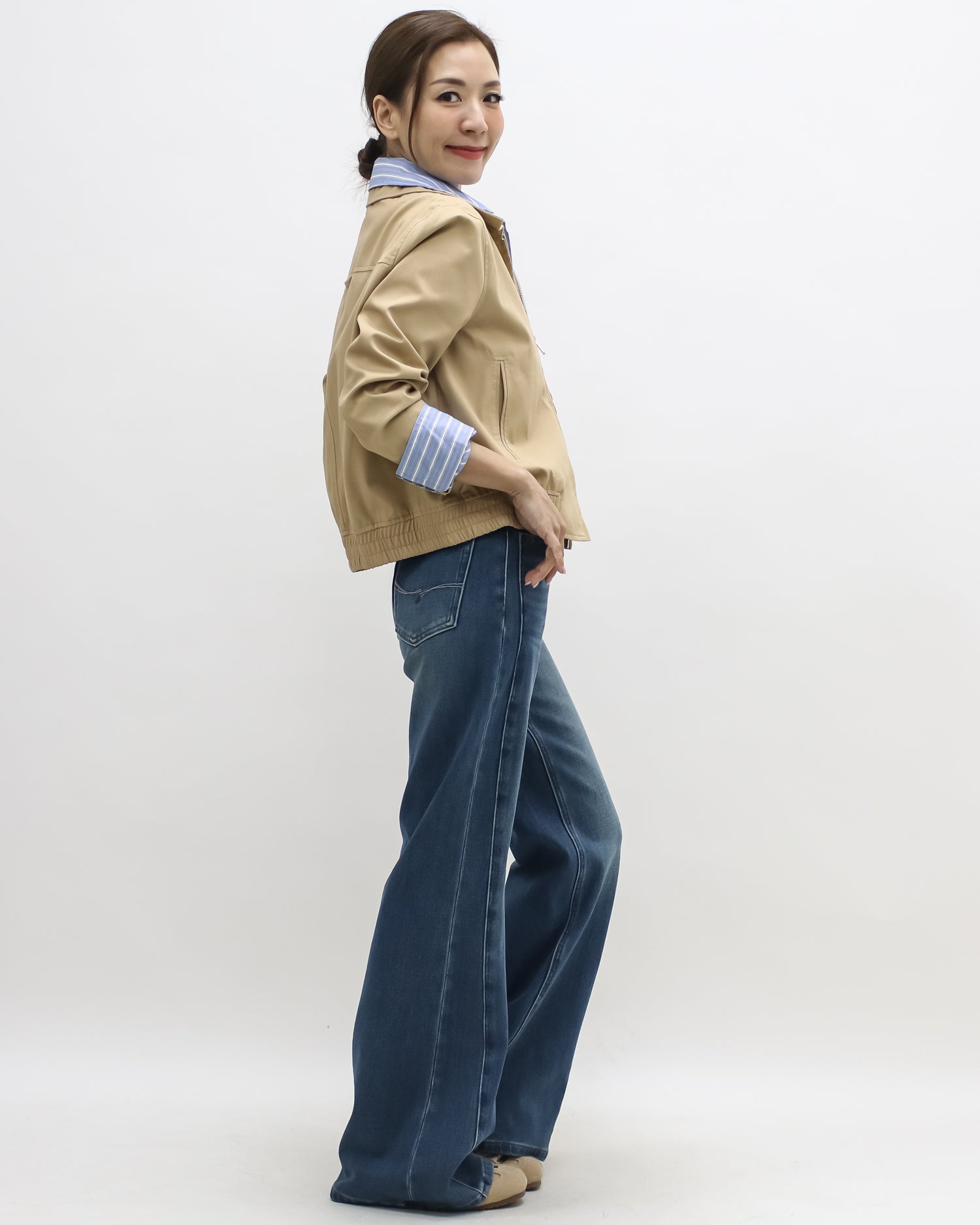 beige w/ blue stripes shirt contrast jacket
